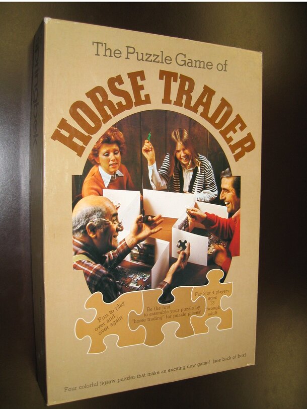 The game consists of four different, but similar, 40-piece puzzles, four stand-up partitions to isolate and hide each player's puzzle area, and a picture card for each of the four puzzles. The puzzles are paintings of four different horses, with each in a similar setting, but in a different season. The puzzle pieces are mixed and distributed facedown, with...