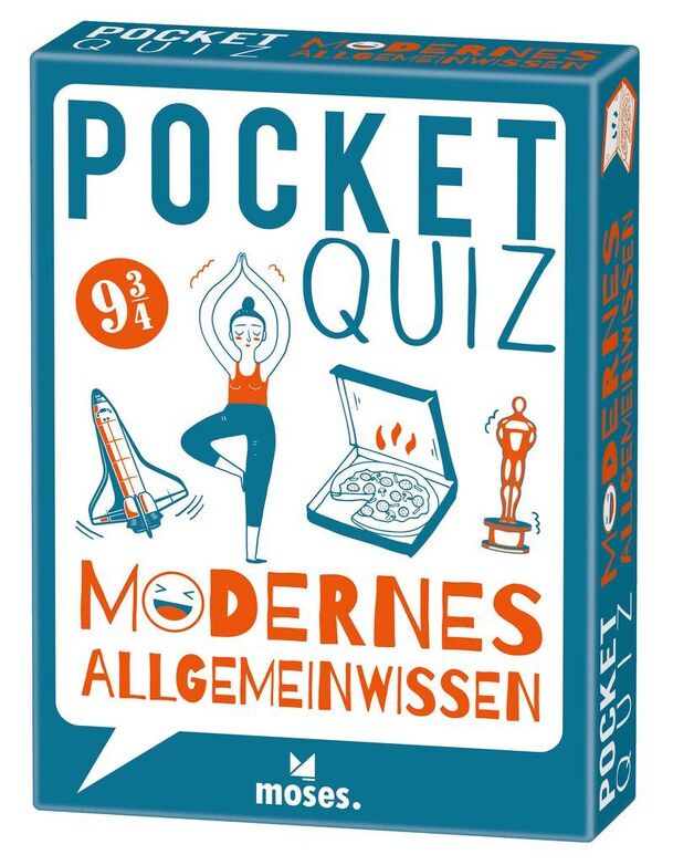 This is a small, pocket-sized trivia game. It contains 50 cards with 3 questions each, most of them with multiple choice options. The backside of each card contains the answers and offers additional information. Most of the cards also show small illustrations. The title translates to "Modern general knowledge" and includes questions about all kinds of...