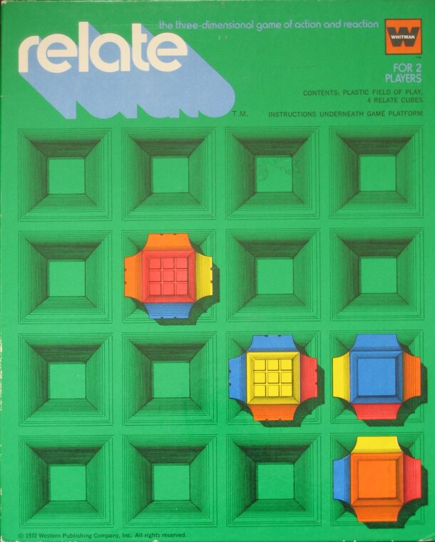 Relate is a 2-player game where the goal is to move one's blocks from his or her starting space to the starting spaces of the opponent. A player does so by pushing the block into an orthogonally adjacent space, which will force the block to rotate to a new face. This typically changes the color showing on the top of the cube, although the blue and orange...