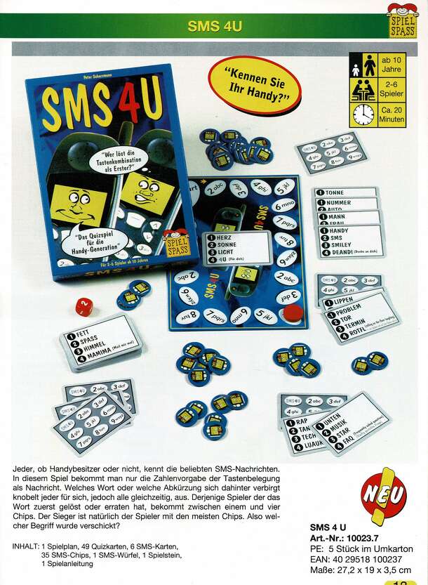 Players use number combinations to decipher which words these combinations would produce on the keypad of a mobile phone. Players take turns rolling a six-sided die (numbers 1-4, x, "no reception"). The active player rolls the die. If he/she rolls "no reception", the die is passed on to the next player. If a number is rolled, the red token is advanced the...