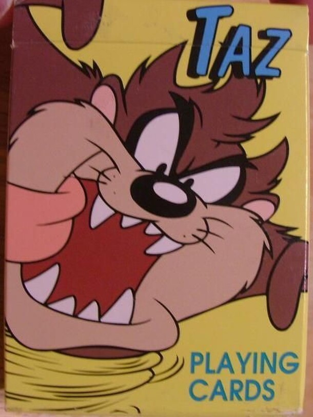 Taz playing cards is a deck of 52 cards plus 2 jokers featuring the Looney Tunes Tasmain Devil that can be used Standard Deck Playing Card Games. In addition each of the standard 52 cards is marked with one or two trails that go from middle of one side of the card to another. Rules are provided in English and French for the Taz-Mayhem game which uses these...