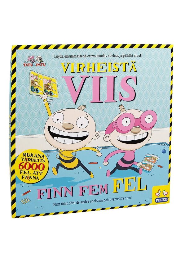 Tatu ja Patu – Virheistä viis has cards with two pictures. Players must find 5, 10 or 15 differences in the pictures and mark them on the cards with whiteboard pens. Players score 0-5 points depending on how many differences they find. There are several rounds played until someone gets 25 points. The game art is based on popular Tatu and Patu children's...