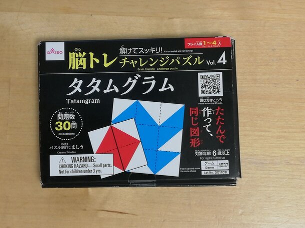 Tatamgram is a folding puzzle that can be played solitaire or as a speed puzzle against others. It consistes of 15 double-sided task cards (30 tasks) that show a shape and one or more colored dots, plus four copies each of origami-like papers in three colors. The papers contain different shapes. The goal is to fold each paper marked by a colored dot on the...