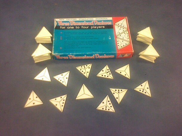 From The Box... Three Dimensional Dominoes > 45 triangular dominoes, each with sectional numbers to be matched up as in conventional dominoes, but wait till you see the challenging differences. > Six exciting "3-D" domino charts included. > One Interesting "Solitaire" domino game chart included Note: "3-D" dominoes was created and designed by mathematical...