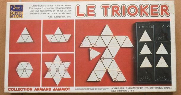 The Trioker pieces are similar to the 24 mac-mahon triangles, except that the values are set at the corners instead of the sides. There is also a 25th special triangle, called Joker There are two boards allowing two different kind of games : a pure abstract game for 2 players, and a bidding game for 2 to 3 players. Also included a set of puzzles to be...