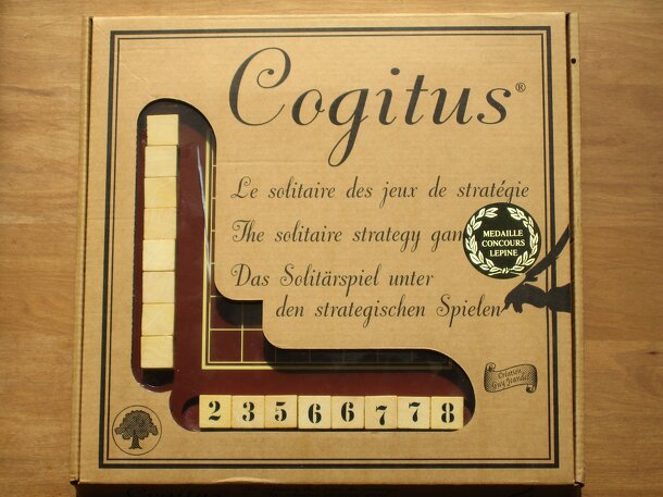 Cogitus is a solitaire strategy game. The aim is to form a suite of numbers, cross-word fashion, and to place all of them on the same grid. The sum of consecutive numbers must not exceed 10(very difficult), 11(difficult), 12(fairly easy), or 13(easy)... according to the level of difficulty chosen. The game received a medal of the Concours Lepine for...