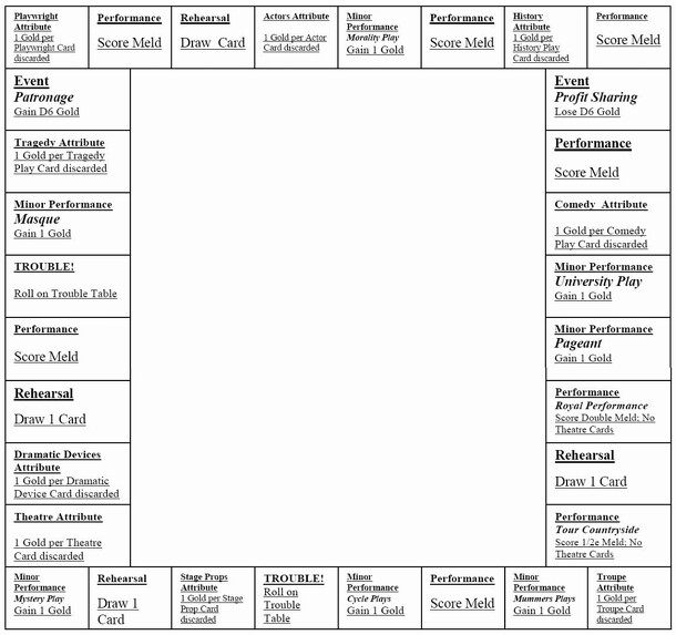 Board Game with a Shakespeare Theme. Each player takes the role of a Theater Troupe during the English Renaissance. A Special deck with suites of cards for Actors, Playwrights, Plays, Dramatic Devices, Stage Props, Troupes, and Theaters is used to stage performances and earn gold. The most profitable Troupe wins. Complete rule set is available for free at:...