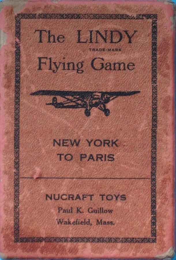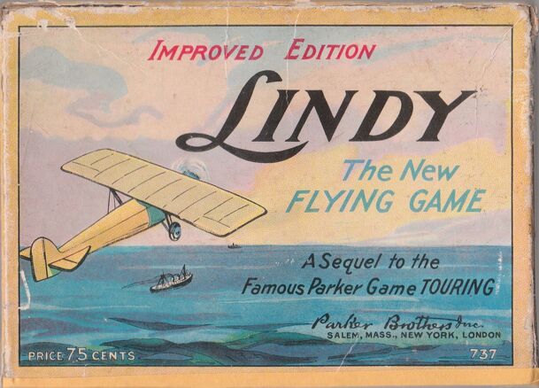 Card game similar to Touring was published in a form fitting box with 75 cards: 39 mileage, 10 take off, 10 weather, 15 hazards and 1 Lucky Lindy. Based on the historic flight of the same year, hazards include forced landing, storm, fog, engine trouble, etc. Inventor was a flier in the US Navy and also made gliders and models. Came out in the same year as...