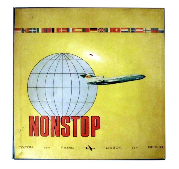 Typical roll-and-move game on the theme "airplane racing". Roll one die, and at landing on certain fields the player must for example move back or forwards or sit one round out. First to land on field #60 is the winner. If you bet money on the planes, the winner get 2/3 of the cash pool; second get the rest. The game is in Norwegian, probably printed in...