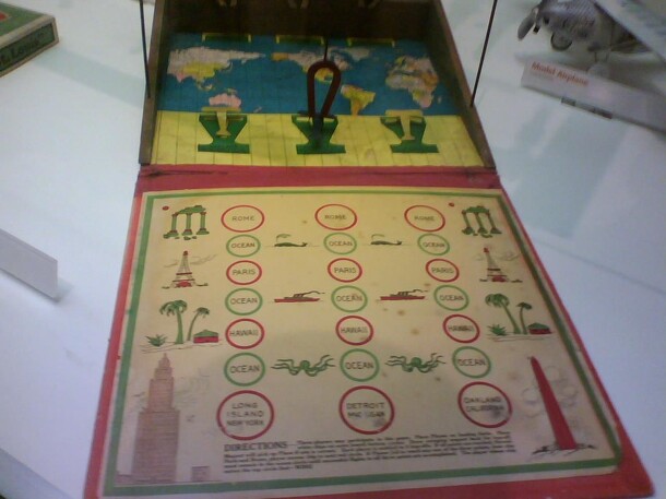 This game is hard to get any details on... It was commercially produced and is in the Smithsonian Udvar-Hazy Aviation Museum extension at Dulles Airport. Given its age and craftsmanship, I have placed the age at 1925. The airplanes actually similar the Spirit of St Louis, but the game bears no resemblance to trying to cross the Atlantic. You use magnets to...