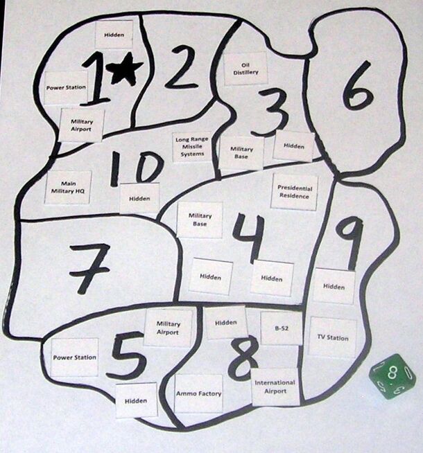"Solo Dice Game. Simulation of an Air War between USA and an imaginary Middle Eastern Nation." The game is played with paper, pencil, a ten-sided die, and one or two six-sided dice. "The player plays the commander of Anti-Aircraft troops of an imaginary Middle Eastern Nation. The goal is to bring down ten American war planes to create anti-war sentiment in...