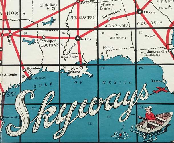 This two-player game says on the board that it was "approved by United Airlines" and appears to have been developed as marketing tool. The back of the board features a large picture of a United Airlines two-engine "Mainliner". The front of the board features a UAL logo. And the playing surface - a map of the United States overlaid with a grid of squares 13...