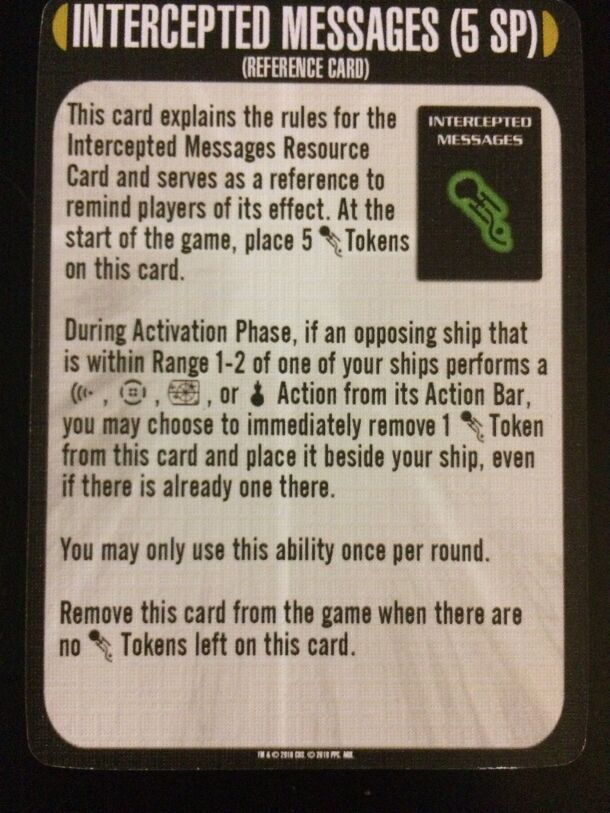 The Intercepted Messages Resource is a participation prize given to players who participated in Tin Man Episode Organized Play Event. It is considered a Resource and costs 5 squadron points. When using this Resource, you receive 5 Evade tokens on the Resource at the start of the game. If an enemy ship performs a certain action from it's Action Bar (Scan...