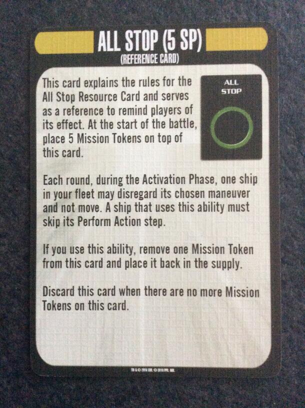 The All Stop Resource is a participation prize given to players who participated in Month 3, "Baiting the Romulans," of the Star Trek: Attack Wing Storyline Organized Play Event, Klingon Civil War. When using this resource, you place 5 Mission Tokens on it at the beginning of the game. Once per round, any one of your ships can choose to disregard it's...