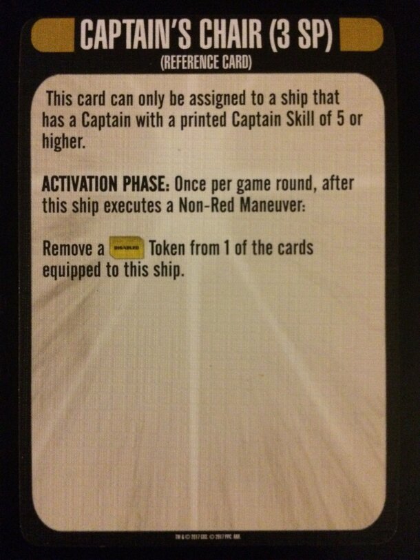 The Captain's Chair Resource is a participation prize given to players who participated in the "Chronological Chaos" Organized Play Event. When used, it can only be assigned to a ship that has a Captain with a printed Captain Skill of 5 or higher. During the activation phase, once per round, the ship to which it is assigned may remove a disabled token from...