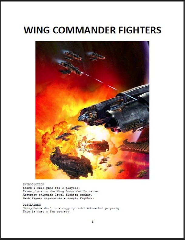 "Board & card game for 2 players. Takes place in the Wing Commander Universe. Abstract skirmish level Fighter combat. Each figure represents a single Fighter. Victory: You win if you destroy the opposing Wing Commander." The game provides statistics for seven Terran Confederation Fighters and seven Kilrathi Fighters. Each player starts with two Heavy...