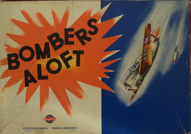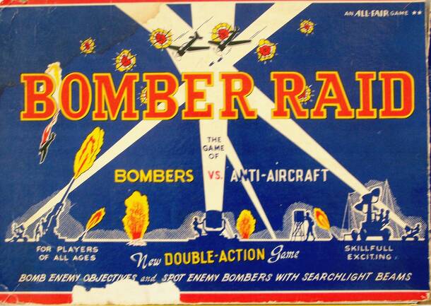 From the rules: The object of the game is to bomb enemy objectives and, at the same time, to spot and bring down attacking enemy bombers before they drop their bombs. Equipment includes the game board, two dice, 2 searchlight beams and 8 bombers. Players place the searchlight on the board with the small end on the X about the searchlight crew and the large...