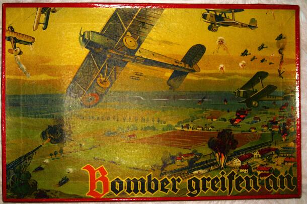 An old war game made during or after World War II. The game is a simple dice game where up to four players moving a playing piece towards an enemy city. Each player is allowed ten raids to the objectives of their choice, with the highest score tabulated at the end of the game declared a winner. If a playing piece lands on a black square during a raid, the...