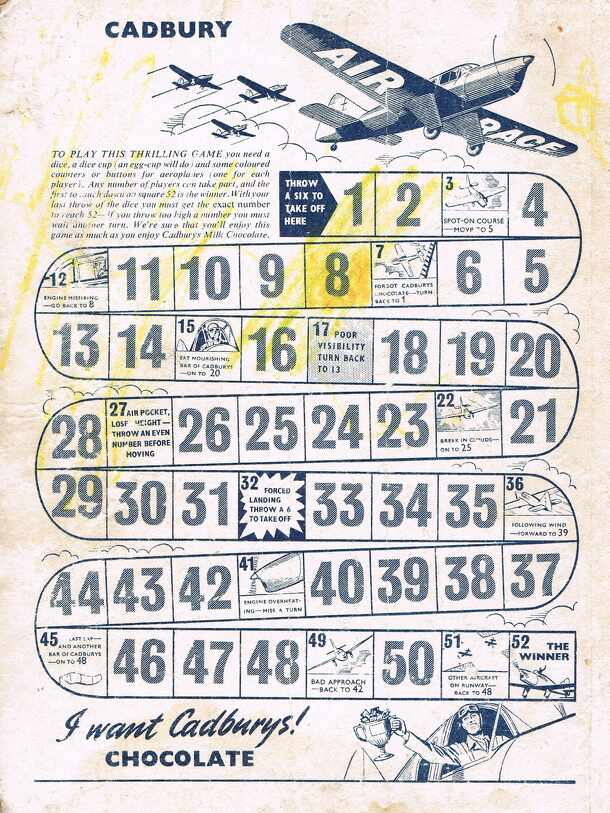 Game published on the back cover to the Knockout Fun Book in 1956. The rules: To play this thrilling game, you need a die, a dice cup (an egg-cup will do) and some coloured counters or buttons for aeroplanes {one for each player). Any number of players can take part, and the first to touch down on square 52 is the winner. With your last throw of the die...