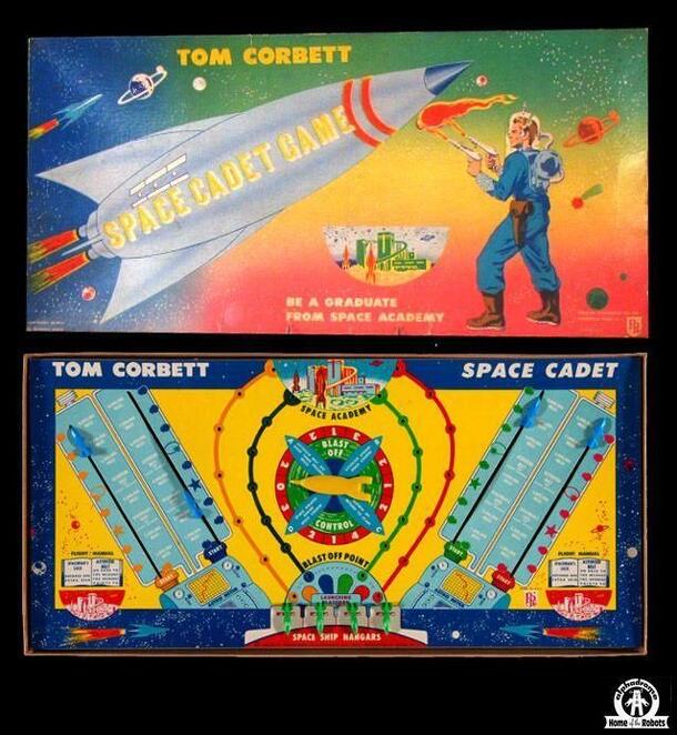 Space board game based on Tom Corbett. Comprises playing board with"Blast Off Control" spinner at center, "Spaceship Hangars - Launching Platform" and four small plastic spaceship playing pieces. 1953 Spin the spinner to determine the number of steps (or special action instructions). Move the ship the number of spaces indicated on your colored path. If it...