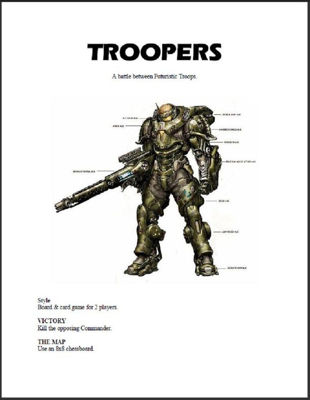 "A battle between Futuristic Troops." Each side has sixteen units: eight Troopers, two Tanks, two Aircraft, two Hovercraft, one Artillery, and one Commander. The object of the game is to kill the opposing Commander. The game is played on a chessboard or any other 8x8 grid. Miniatures or counters are used to represent the units. A custom deck of cards is...