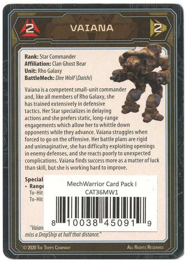 Pack contains 9 double-sided MechWarrior pilot Cards, for a total of 18 named MechWarriors. • Maconaquea Akerlund/Okubo Henderson • Dieter Shackle/David Kendal • Zaïre Danielson/Zhong Shui • Maxim Vasiliev/Arthur Rutherford • Vyna/Garo • Hela/Magnus • Stephania/Elvin • Ivan/Bestla • Polina Vickers/Eluris A Clan Invasion Kickstarter exclusive, Card Pack II...