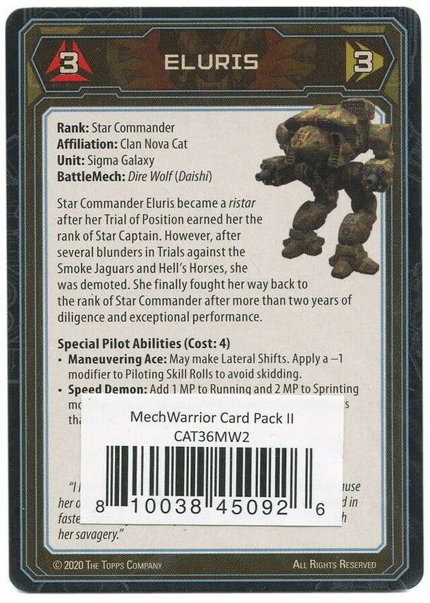 Pack contains 9 double-sided MechWarrior pilot Cards, for a total of 18 named MechWarriors. • Yurika Suzume/Mackenzie Cross • Robert Otek/Tracy Maxwell Kent • Scotty Rosek/Sawako Maki • Garrett Cedeno/Cole • Odilon Rodriguez/Jorma Mercer • Jillian Snuka/Audrey • Jevanrod Ward/Rauf Icaza • Trent Leroux/Geertruida • Reshondra Descatris/Vaiana A Clan Invasion...
