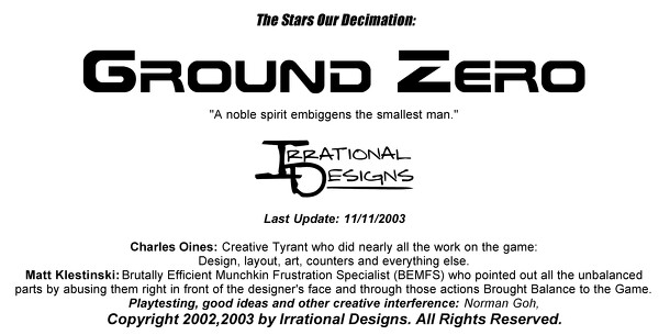 THE STARS Our DECIMATION is the name for a series of interrelated science fiction wargames built around the actions mechanic. TSOD games all feature hand-built rules, hex grid regulated movement, a unique actions system, and versatile unit design rules. Ground Zero is a tactical ground combat game, best suited to running company-level combats. Rules are...