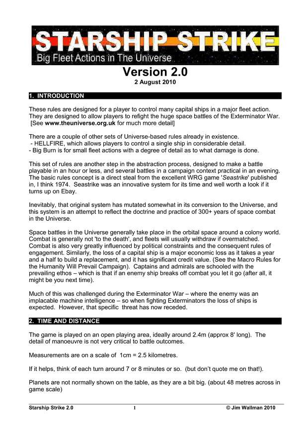 These rules are designed for a player to control many capital ships in a major fleet action. They are designed to allow players to refight the huge space battles of the Exterminator War. There are a couple of other sets of Universe-based rules already in existence. HELLFIRE, which allows players to control a single ship in considerable detail. Big Burn is...