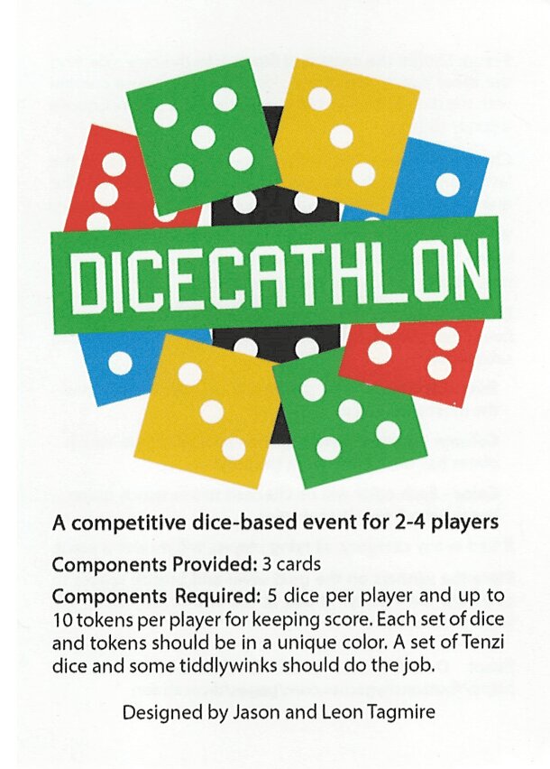 A competitive dice-based event for 2-4 players. Released in the February 2019 Board Game of the Month Club $10+ package. Components: 3 Cards (provided), 5 dice per player and up to 10 tokens per player for keeping score. Each set of dice and tokens should be in a unique color. A set of Tenzi dice and some tiddlywinks should do the job. Setup: Shuffle the...