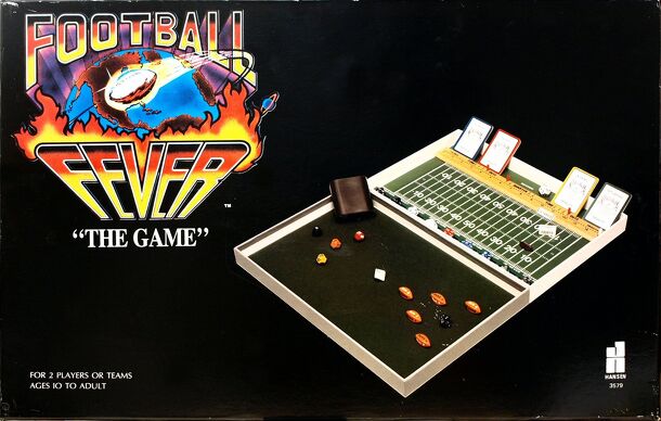 Football Fever is a football game which uses various shapes and color dice to call plays and conduct all aspects of a football game. It comes in a case with a built-in playing field and scoreboard, clock as well as yardage, ball and down markers along with pegs to note time, quarter, time outs. There are compartments to hold various dice for reference...