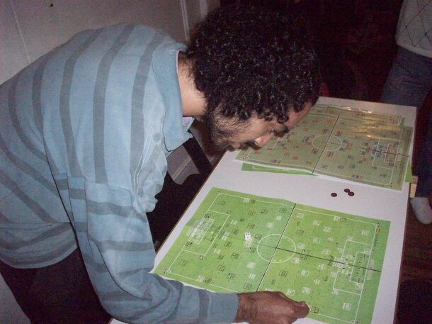 Each player has 10 field players and one goalie. Movement is determined by a die. The direction may be changed once during movement. If a player gets on the same space as the ball he gets an extra move for the ball. The ball can't change direction during movement. The ball may move through occupied spaces. If the movement of the ball ends not on the space...
