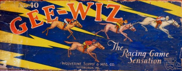 This game features a fly wheel and a starting grid for 6 horses. From the rules: Before running the race be certain that all horses are lined up evenly at the barrier (starting point) and that all the flags at the opposite end of the track are lowered. To operate, hook loop in string over the pin in the shaft and wind by turning the fly wheel away from you...