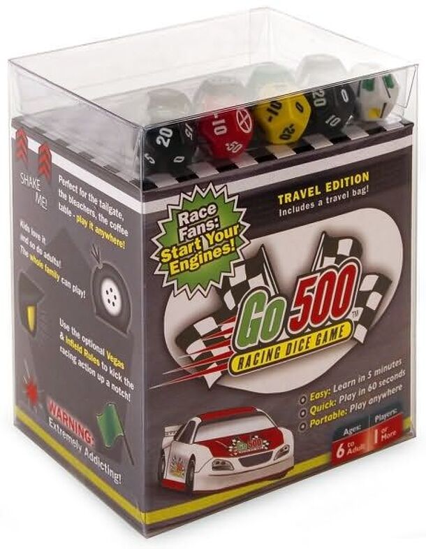 A Stock Car racing themed "push your luck" dice game. Game consists of nine dice (five Black 'Track' dice, 1 White 'Flag' die, 1 Green 'Power' die, 1 Yellow 'Pit', and 1 Red 'Crash' die), dice cup, score sheet, rules and a drawstring travel bag. Object of the game is to be the first player to accumulate 500 miles (points) by rolling the dice. As is typical...