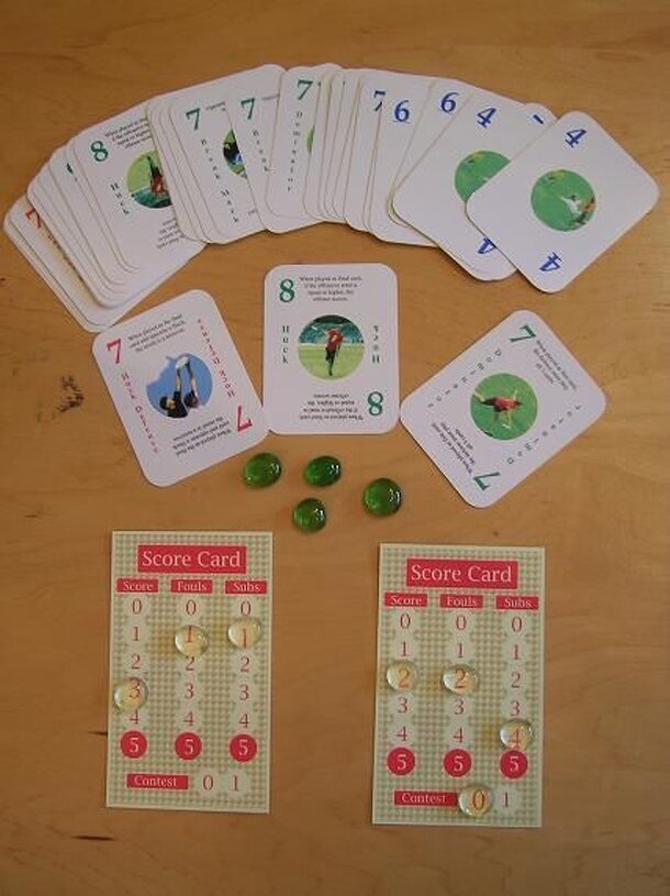 A Soccer card game. 96 action cards contain offensive tactics on one end and corresponding defensive tactics on the other. The cards are oriented in the hand differently depending on whether you are the attacker or the defender. 3 Cards depict the field and 1 card depicts the player in possession. The offense chooses an attacking strategy (card) and the...