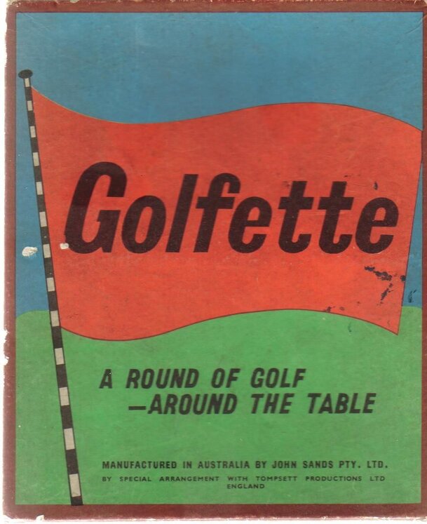 This game, endorsed by Lucille Ball, is a nine-hole tabletop miniature golf course. The course is molded plastic, complete with trees and water hazards. Some holes have special obstacles such as a tunnel, bridge, and a waterwheel. Everything slopes down to the center where a small golfer stands. He is controlled from the side of the board using a knob to...