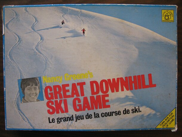 The Great Downhill Ski Game is a tile laying game for 1 to 4 skiers, with a large board of white squares, many with green triangles representing pine trees. There are 256 trail tiles showing the parallel lines the skis make in the snow. These go in straight lines, diagonals, turns and sharp turns and a few have 2 trails making crossovers. Players draw ten...