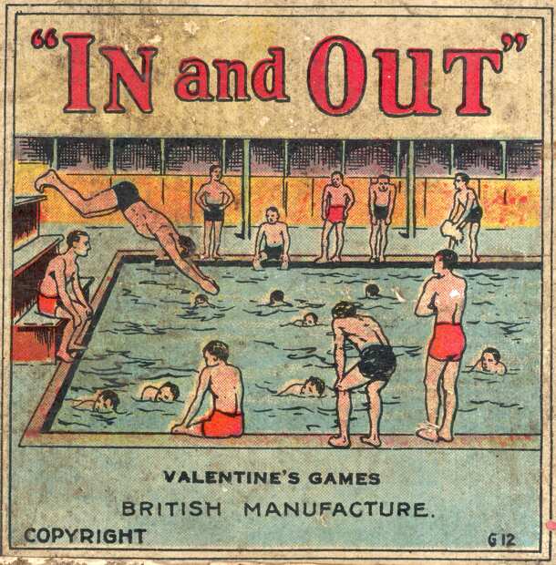 In and Out is a simple roll and move game based on a swimming "Bath". The edge of the pool is numbered 1 to 54. Ten of the squares are entrances to the pool and when the player lands on them they must roll again and follow the path of a swimmer through the water back to the poolside. The pool sections are similar to the familiar snakes and ladders, with...