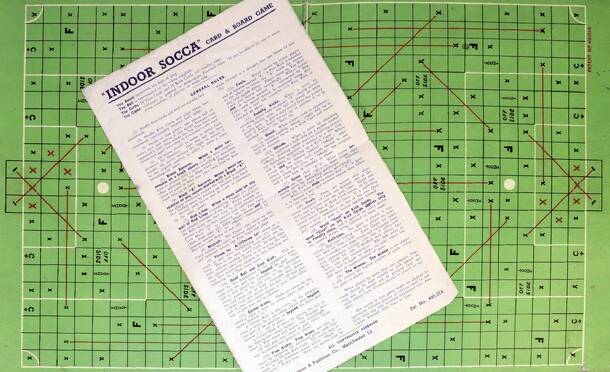 Vintage board game played with cards. Players draw kick and pass cards to determine every action, moving, passing, shooting, or fouls, and the ball marker advances across the grid pitch according to those results. Special areas on the board indicate off-side, shooting, defending, and turnovers. Goals are scored when a card succeeds on a special location....