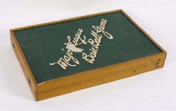 The wooden frame game box folds open to display the baseball field on one half and a large spinner on the other half. The spinner lists various results in two concentric rings - "hit", "ball", "strike" and "out" appear all around the outermost ring, while various other results appear sporadically in the inner ring ("foul", "fly to center", "hit to right"...