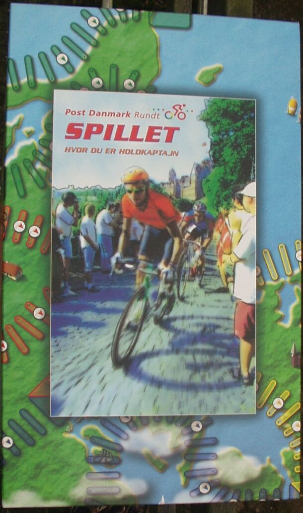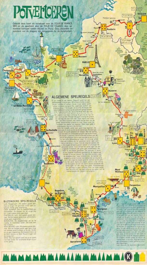 This Dutch cycling game from 1965 was enclosed in the Dutch weekly magazine, called Revue. The gameboard, which is made from glossy magazine paper, has a 'board' of 38 x 35 cm. The game also contains several tokens, which you had to cut out from the magazine. There is a green and yellow jersey, the polkadot mountain jersey, a tour-caravan token and several...