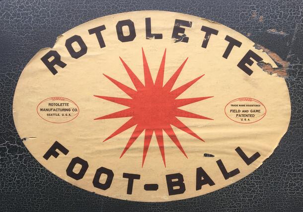 This 1930s game came in a solid wood box. The lid lifted off to form the playing field, with individual yard markings and eight lines running the length of the field lettered A-G. A wooden bar on a slider is used to mark the position of the ball, and there is a metal 10-yard marker that slides up one side of the lid. The base has a large mechanism in the...