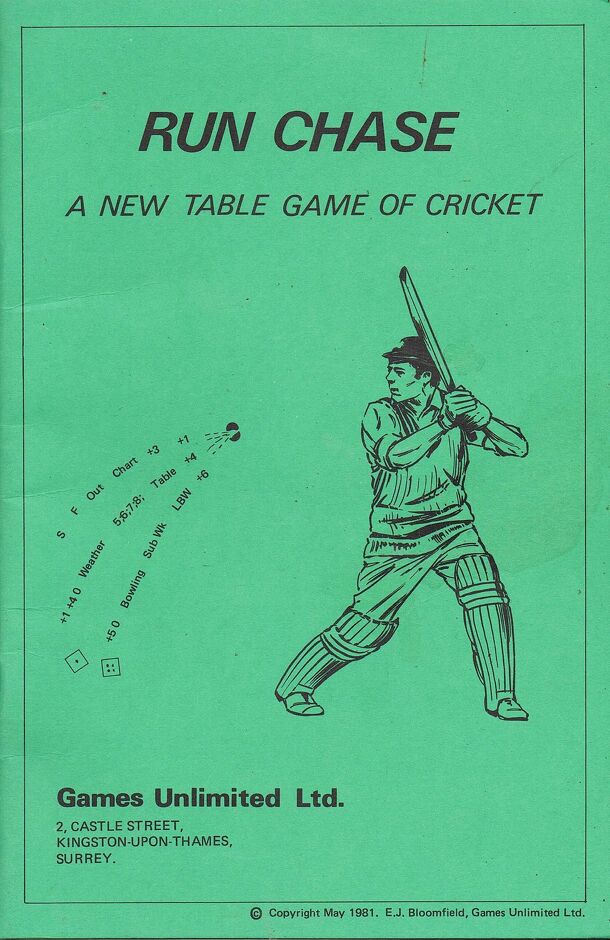 From the blurb. RUNS on the BOARD' is a realistic cricket game involving skill, tactics, tension, risk, excitement & unpredictability. It is designed to have a high scoring rate (average 14 runs per over) allowing a single innings to be completed in about 30 minutes. Batting & Bowling cards include an ingenious colour coding system which makes the game...
