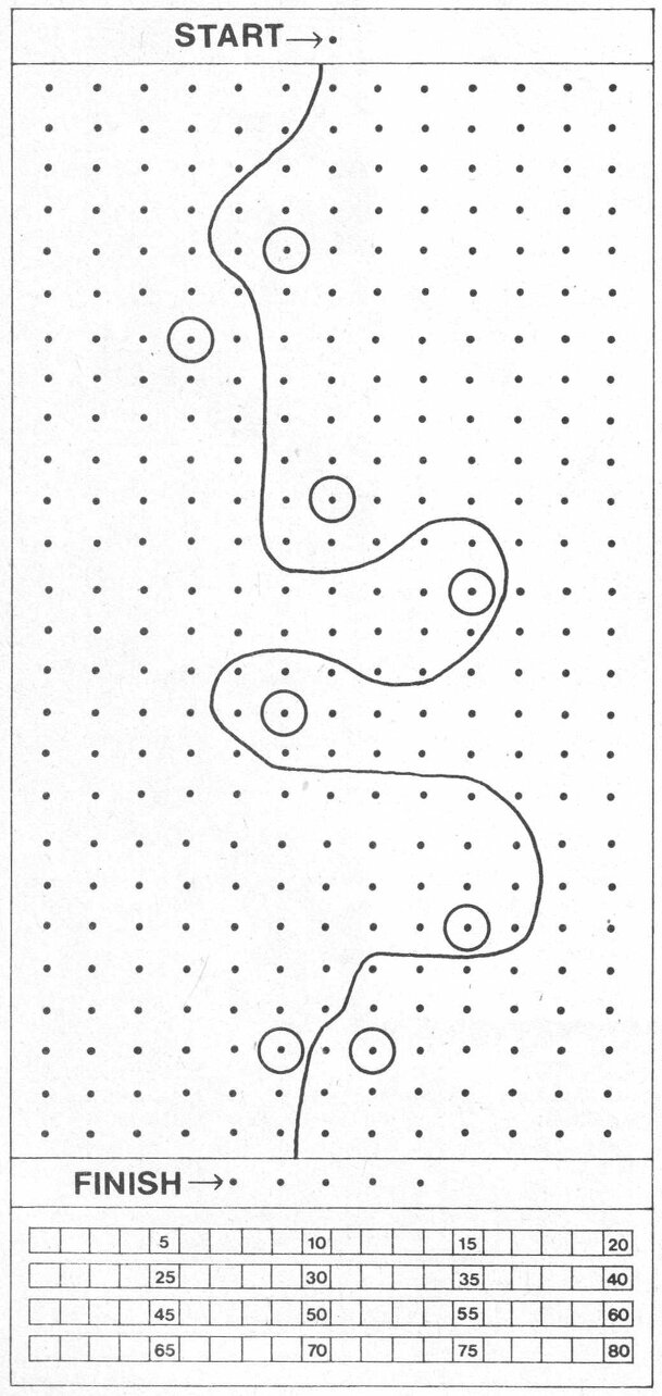 Slalom is a paper-and-pencil game for "any number" of players. Each player has a sheet with a point grid and a slalom course through it. A turn consists of rolling the dice and choosing one of three movement options. Players must pass each gate on the correct side. Players mark off "seconds" for each die roll and mark off more for deviating from the ideal...