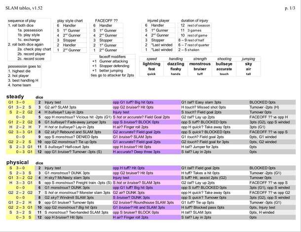 SLAM is a tabletop simulation of the full-contact, high-flying sport of slamball. In SLAM, each minute of the game will feature an exchange and a highlight. The exchange streamlines back-and-forth play producing a baseline score for each team. The highlight then focuses in on the talents and play style of the individual players. SLAM is primarily intended...