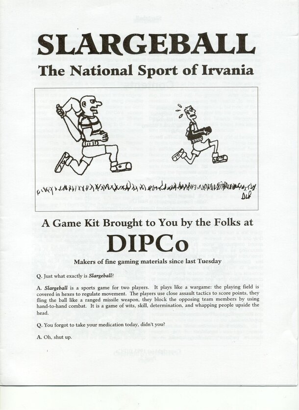 Slargeball is a sports game for two players. It plays like a wargame: the playing field is covered in hexes to regulate movement. The players use close assault tactics to score points, they fling the ball like a ranged missile weapon, they block the opposing team members by using hand-to-hand combat. It is a game of wits, skill, determination, and whapping...