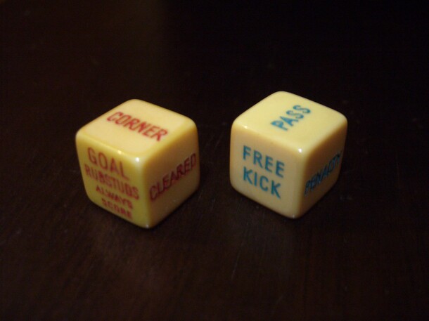 Socca Dice is a little dice game with 2 dice, one with green ink and one with red ink. It is a step by step dice rolling game. The players start with the green die. The sides are Pass, Free-Kick, Shoot, Penalty, Robbed, Throw-In which decides if you can throw the dice again, loose and give the dice to another player, or use the red die next. The sides of...