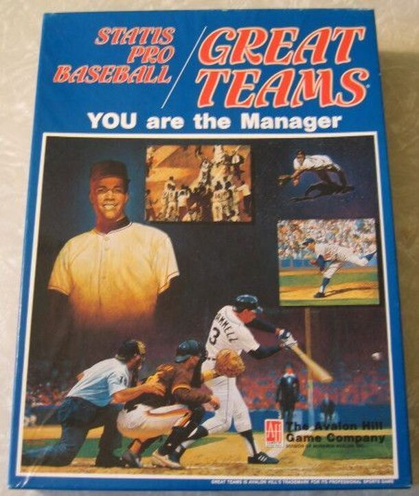 Statis-Pro Baseball Great Teams serves as a stand-alone game as well as an add-on to the excellent baseball simulation series. Included in the bookshelf box: (1) Gameboard (1) Rules (1) Scorepad (1) Set, fast-action cards [98 cards] (1) Set, player cards (4) Out charts (3) Pawns for baserunners The player cards included in the set were for the following...