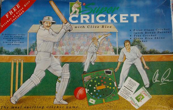 Super Cricket with clive rice is a simple cricket simulation game for 2 players. The fielding player determines fielding positions with the aid of plastic men. The batting player rolls two different types of die to determine the location of where the ball ends. Cards are drawn when specific locations are rolled to determine the outcome. Limited overs and...
