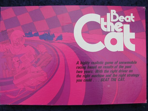 A snowmobile racing game ("Cat" refers to the "Arctic Cat" model of snowmobile) with individually rated machines and drivers. Hard to find and collectible, it has a plastic-covered board with slots for vehicle and driver cards, so that maneuvers can be marked during the course of the game. The board is divided into regions with different speed...